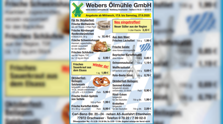 Webers Ölmühle in Mahlberg-Orschweier startet mit frischen Angeboten rund ums Oktoberfest, Grillen und Meeresspezialitäten. Wer regional einkaufen will, findet hier eine starke Auswahl.